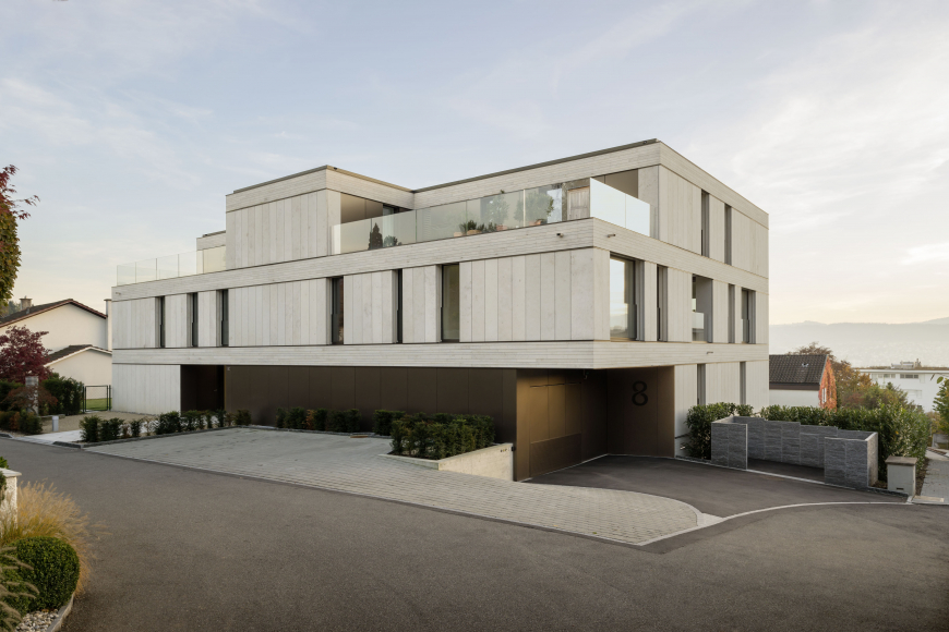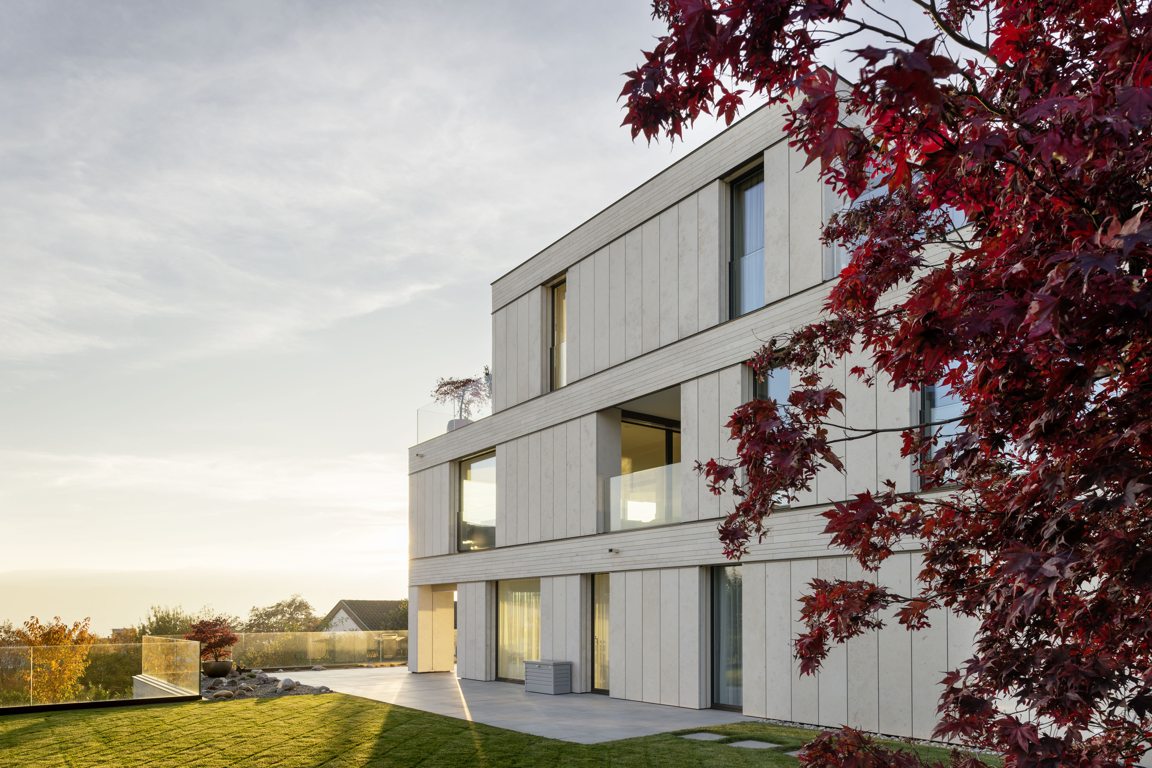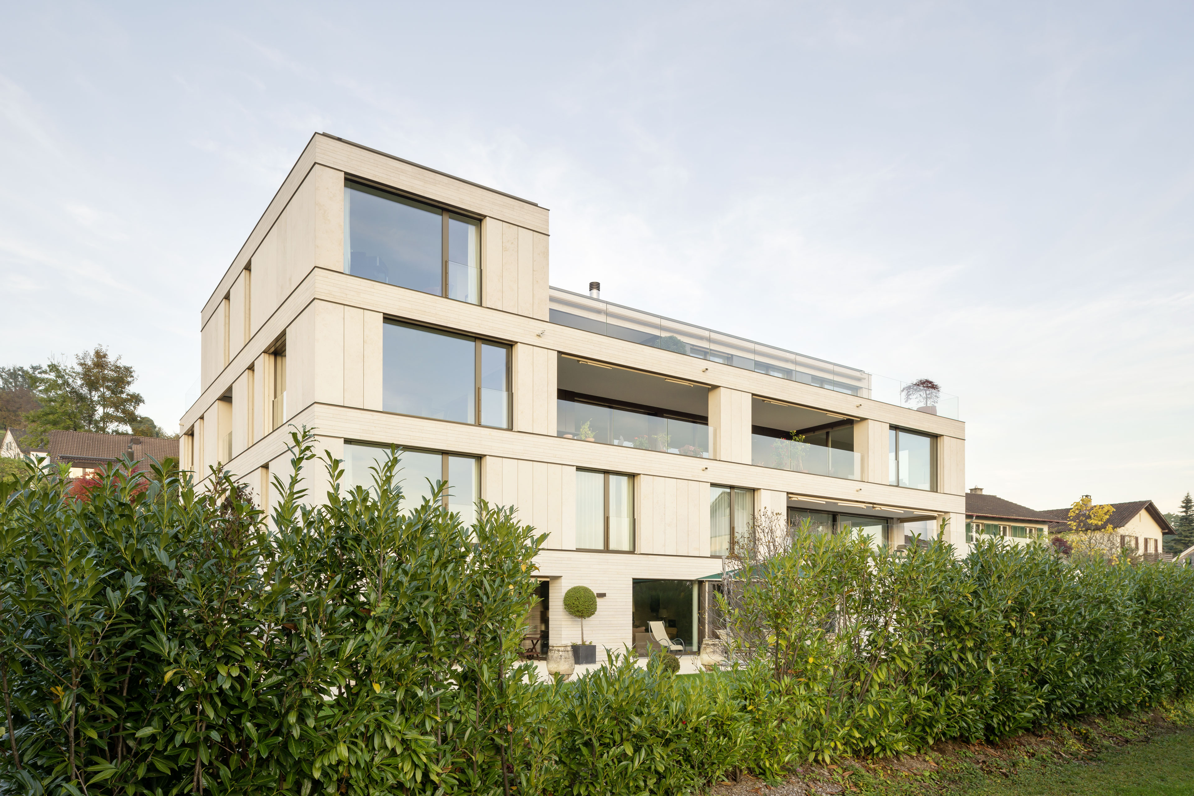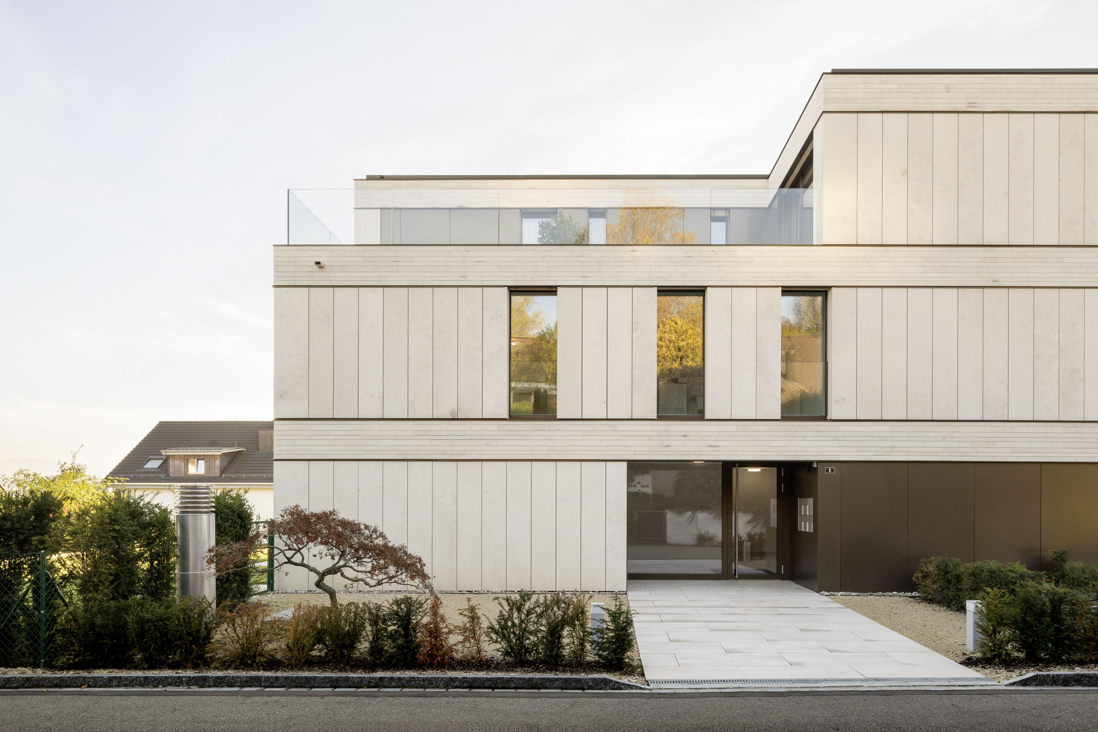 Projekt: Mehrfamilienhaus mit 4 Etagenwohnungen in gehobenem Eigentumswohnungsbedarf, zentrale Unterniveaugarage mit 11 Parkplätzen, Fassadengestaltung mit Natursteinplatten, Minergie zertifiziert