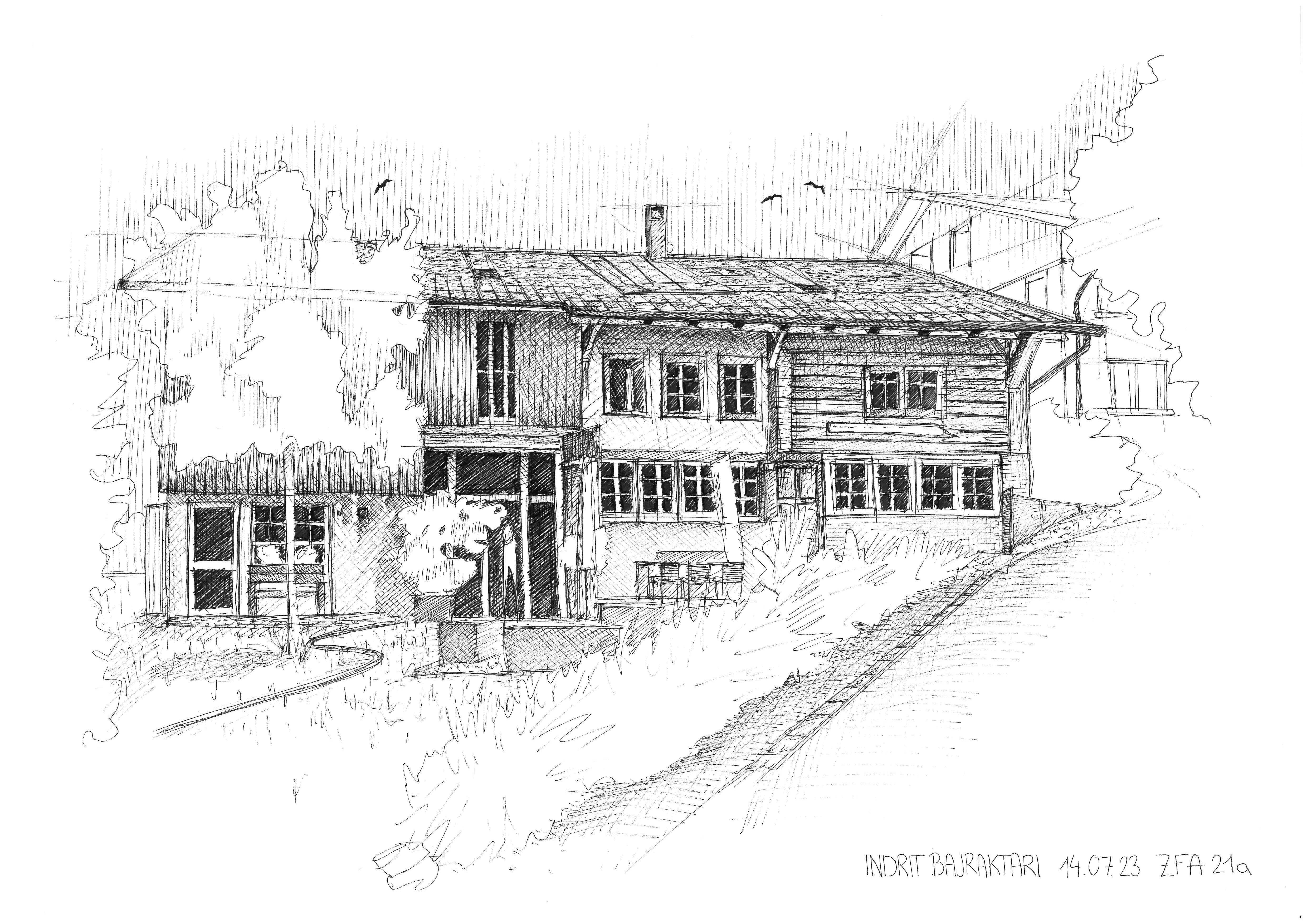 Zum Abschied des Rektors der GBW wurden durch die Lehrer 3 GBW Talente ausgesucht, die etwas für das Abschiedsgeschenk gestallten durftet. Indrit, unser Lehrling der Ende Monat in sein 3.-tes Lehrjahr wechselt, durfte das Haus des Rektors gemäss einem Foto skizzieren.