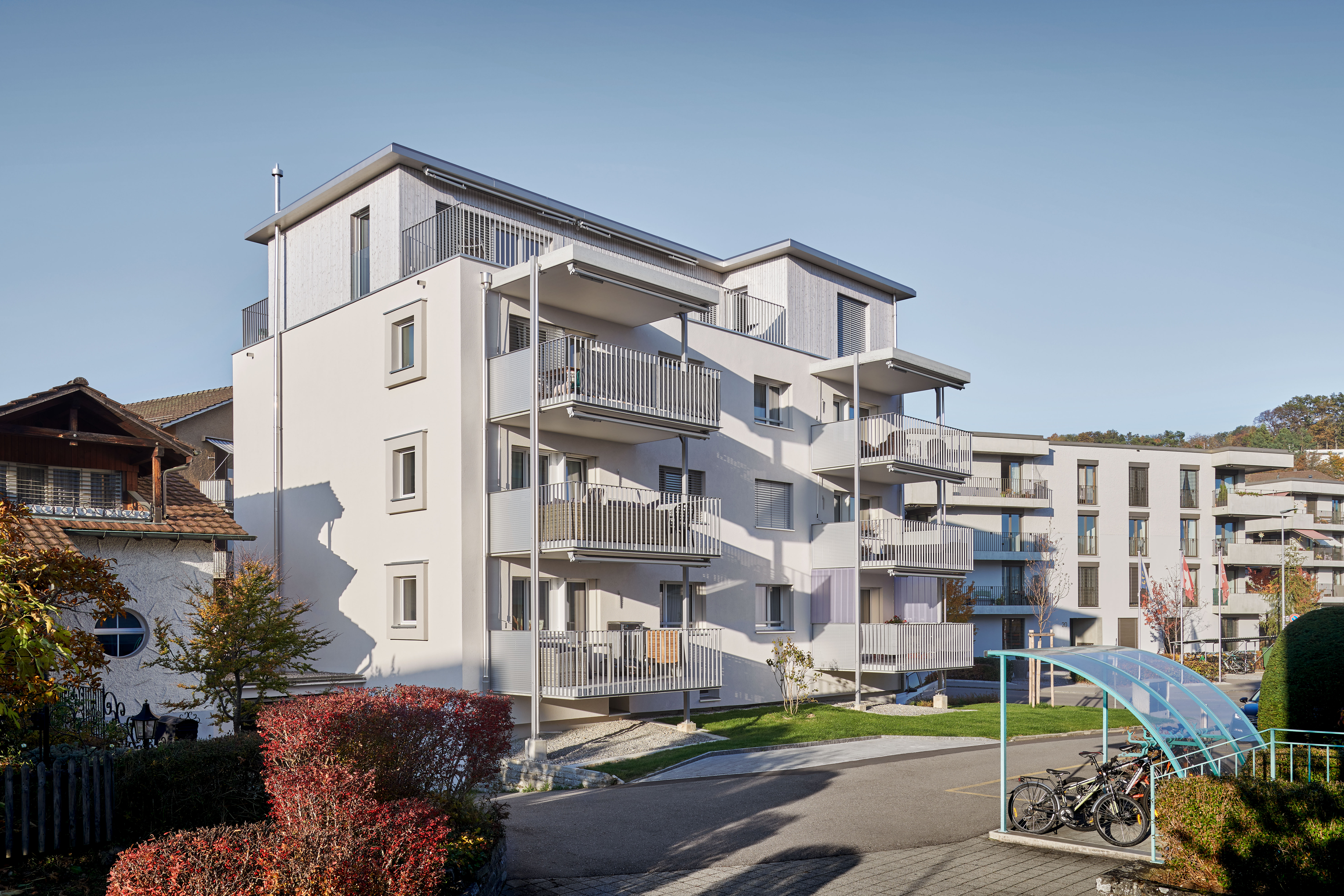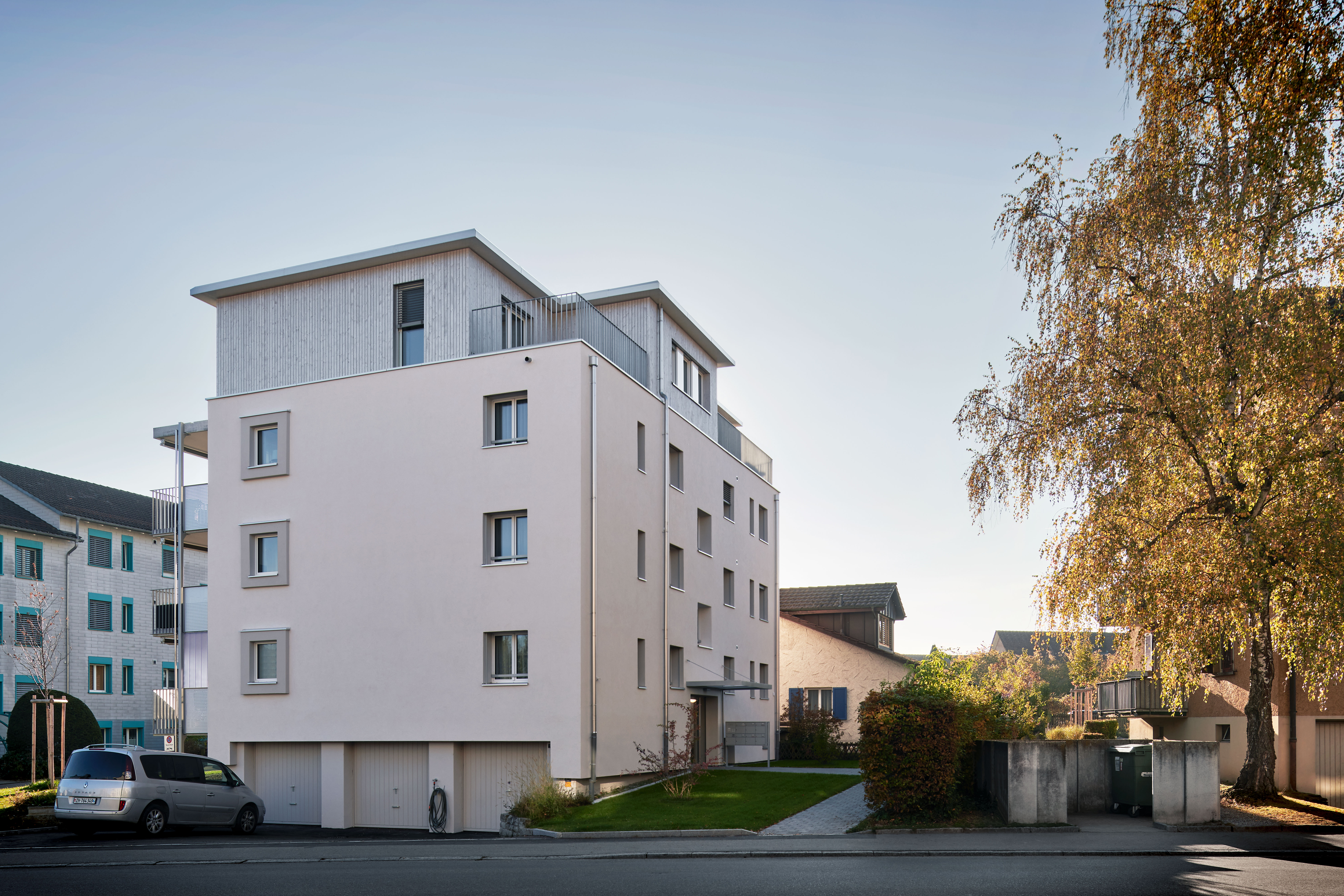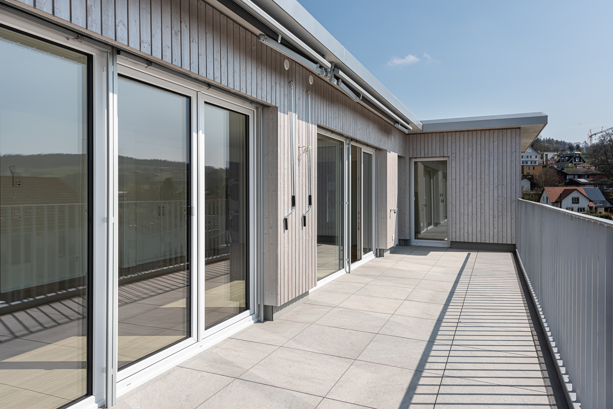Projekt: Der Altbau aus den frühen 60er-Jahren wurde komplett modernisiert. Um zeitgemässe Mietwohnungen anbieten zu können, wurde die Fassade energetisch saniert und die haustechnischen Installationen sowie der Innenausbau mehrheitlich erneuert. Mit der Ausnützungsreserve der Liegenschaft wurde zum Einen der Anbau von Balkonen und zum Anderen ein Ersatz des Giebeldaches durch ein Attikageschoss realisiert. Der Attikaaufbau sowie die Balkone sind in Fertigmodulbauweise erstellt, um die Lastabtragung auf die bestehende Gebäudestruktur möglichst gering zu halten und die Bauzeit verkürzen zu können. Das Mehrfamilienhaus umfasst heute sieben attraktive 3 1/2-Zimmer-Wohnungen an zentraler Lage in Bülach.
