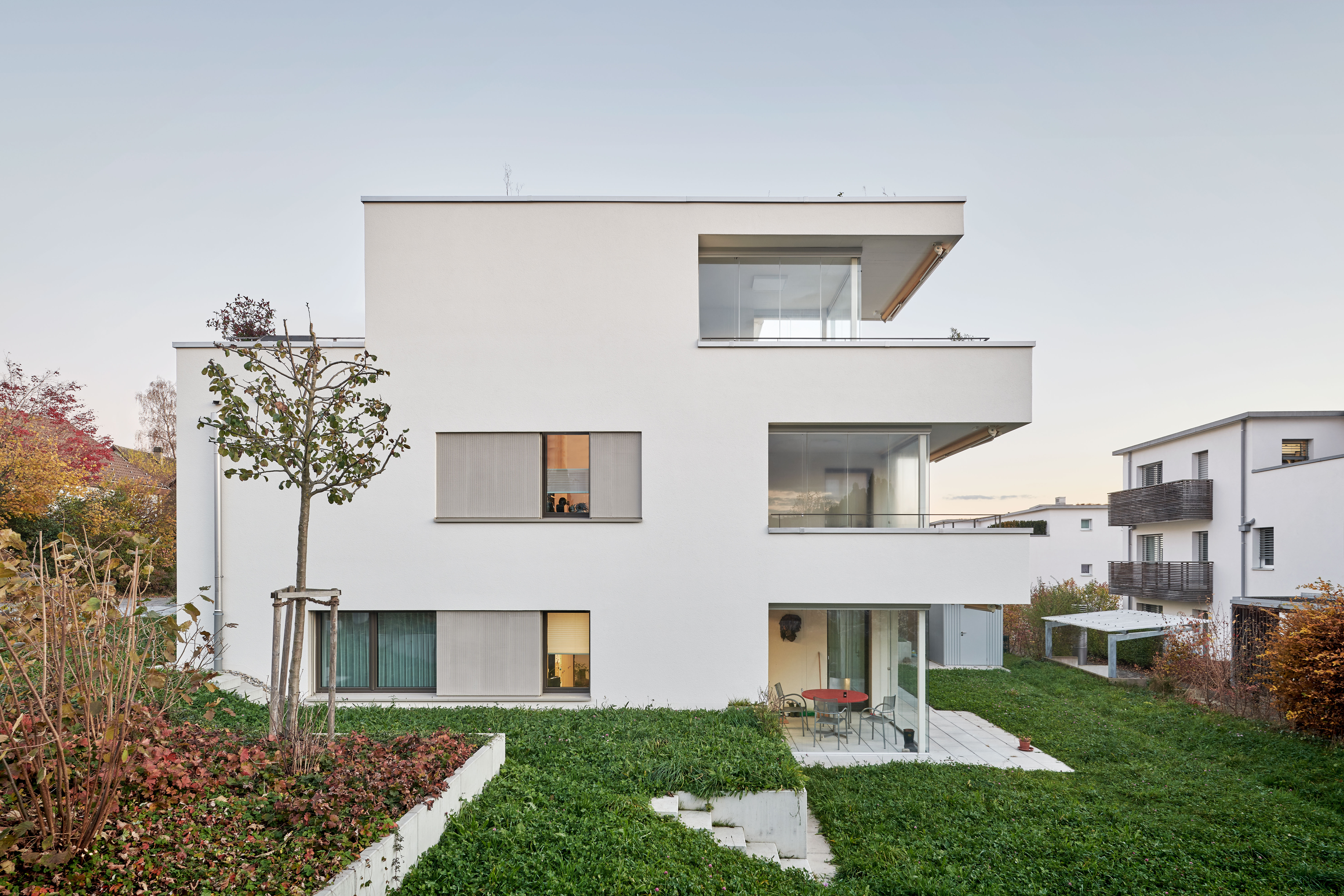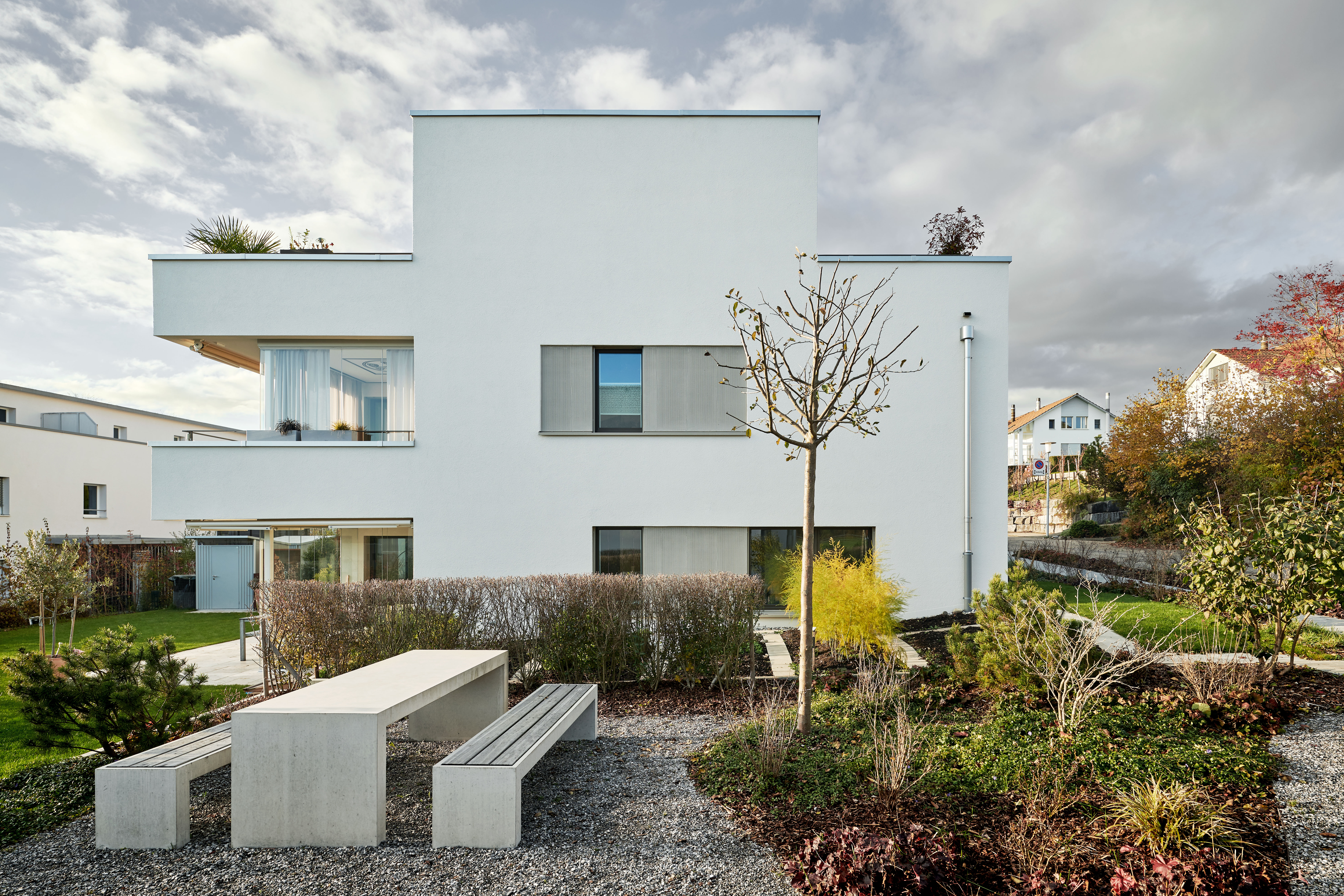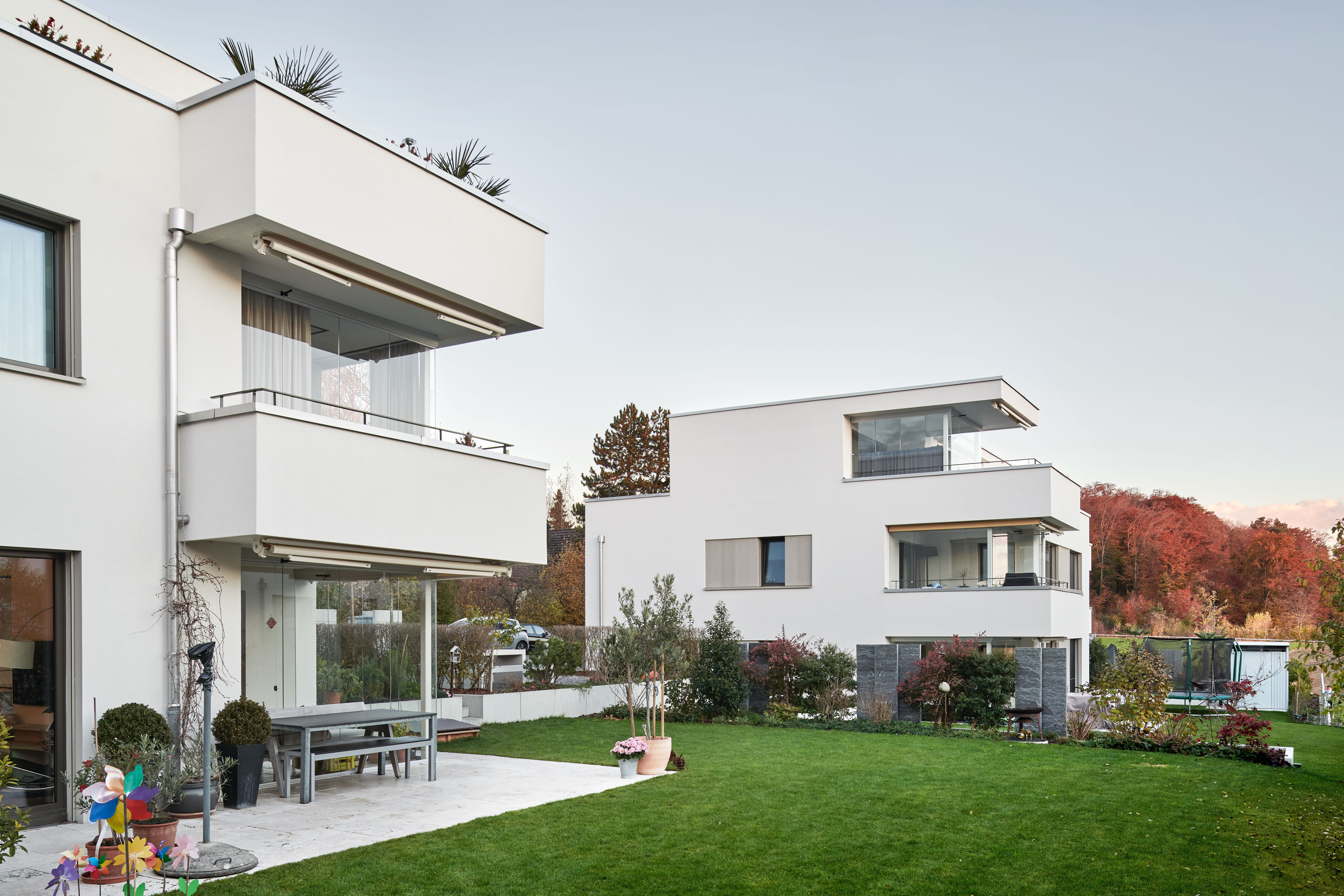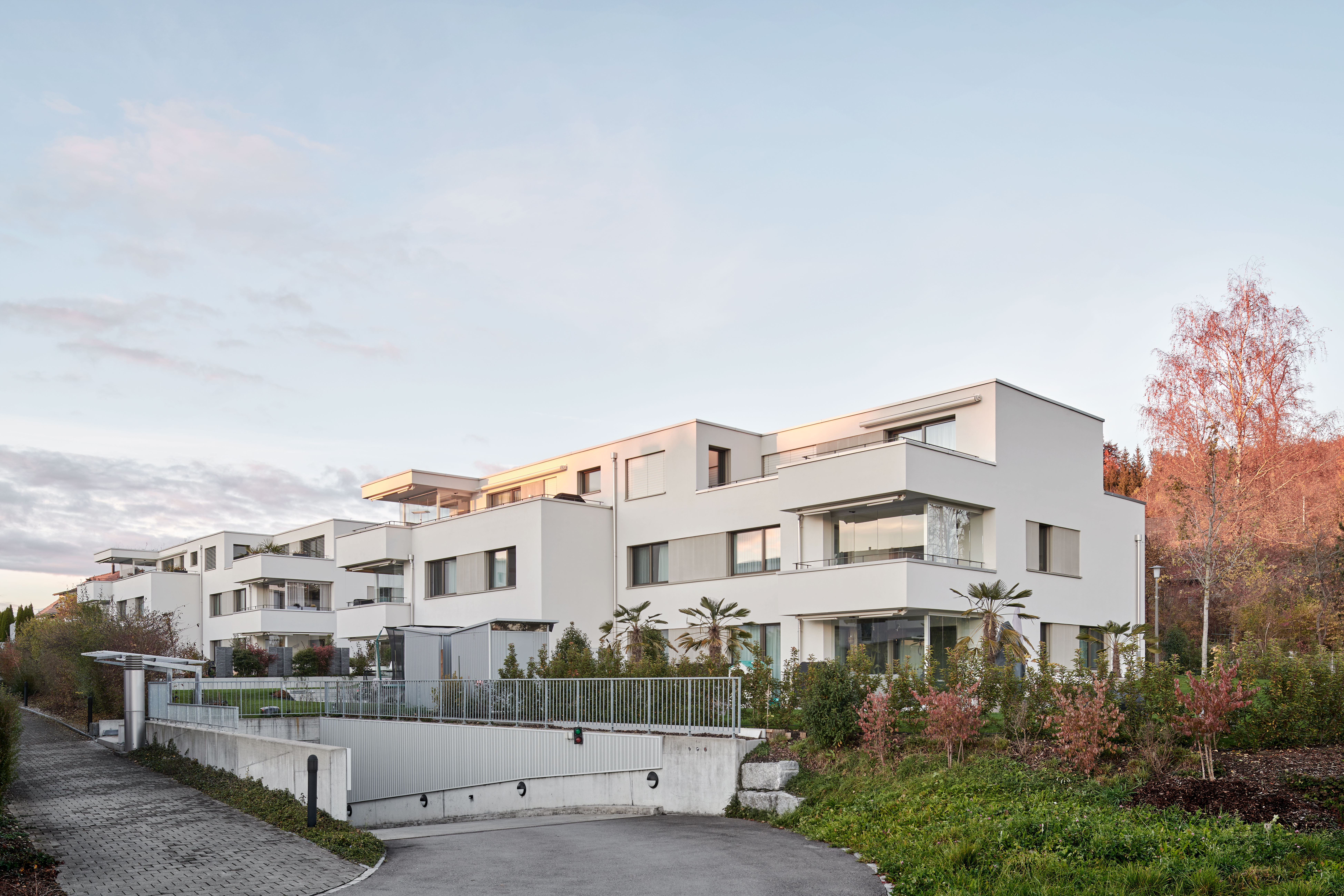 Projekt: In naturnaher und doch zentraler Umgebung sind zwei Mehrfamilienhäuser mit10 grosszügige 3.5 – 5.5 Zimmer Wohnungen entstanden. Die moderne Architektur wurde im MINERGIE®-Standard gebaut. Alle Wohnungen sind von der Tiefgarage mit dem Lift erschlossen. Die grosszügig geschnittenen Grundrisse verfügen über einen gedeckten mit Windschutzglässern geschützten Aussenbereich.