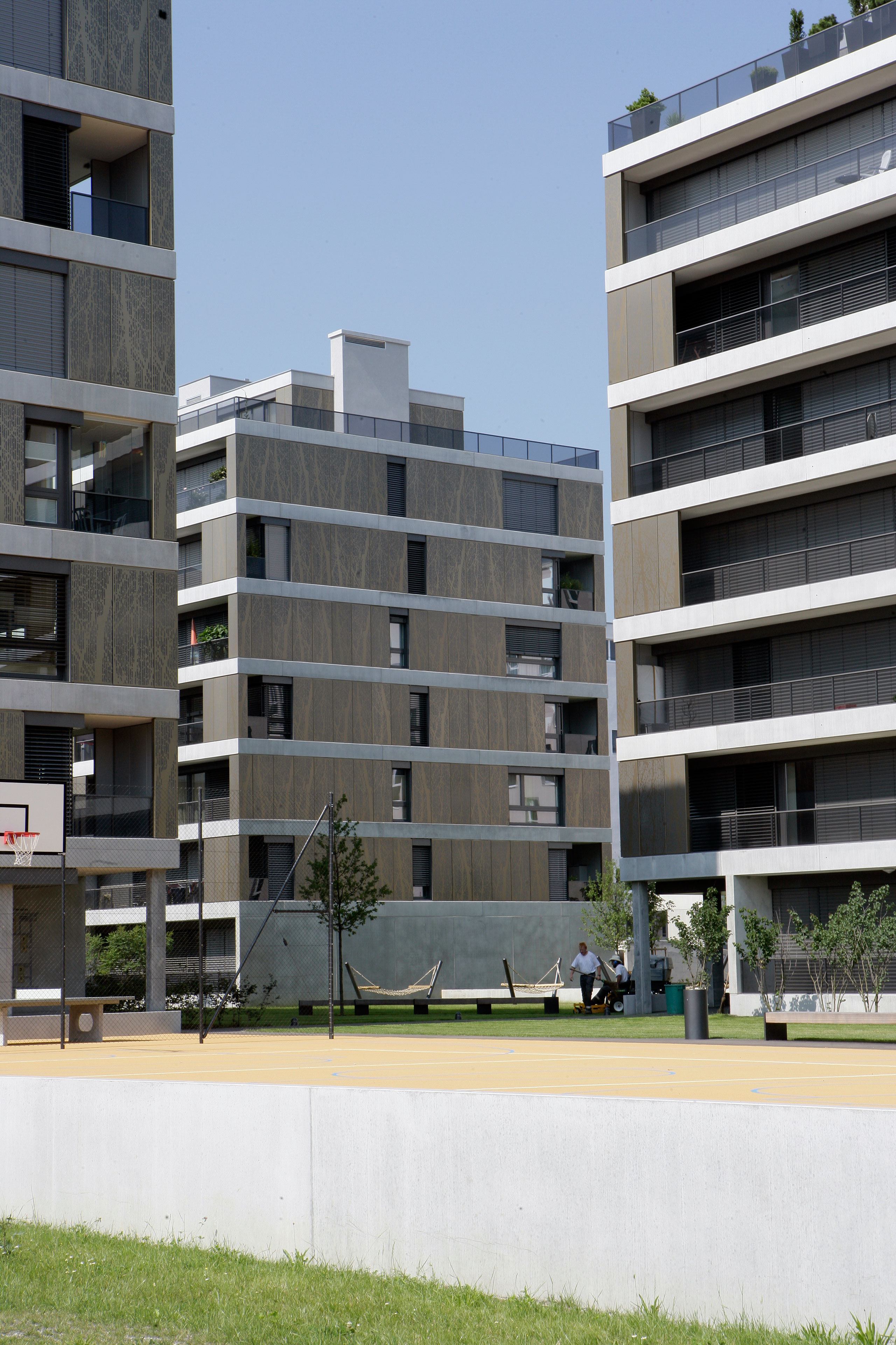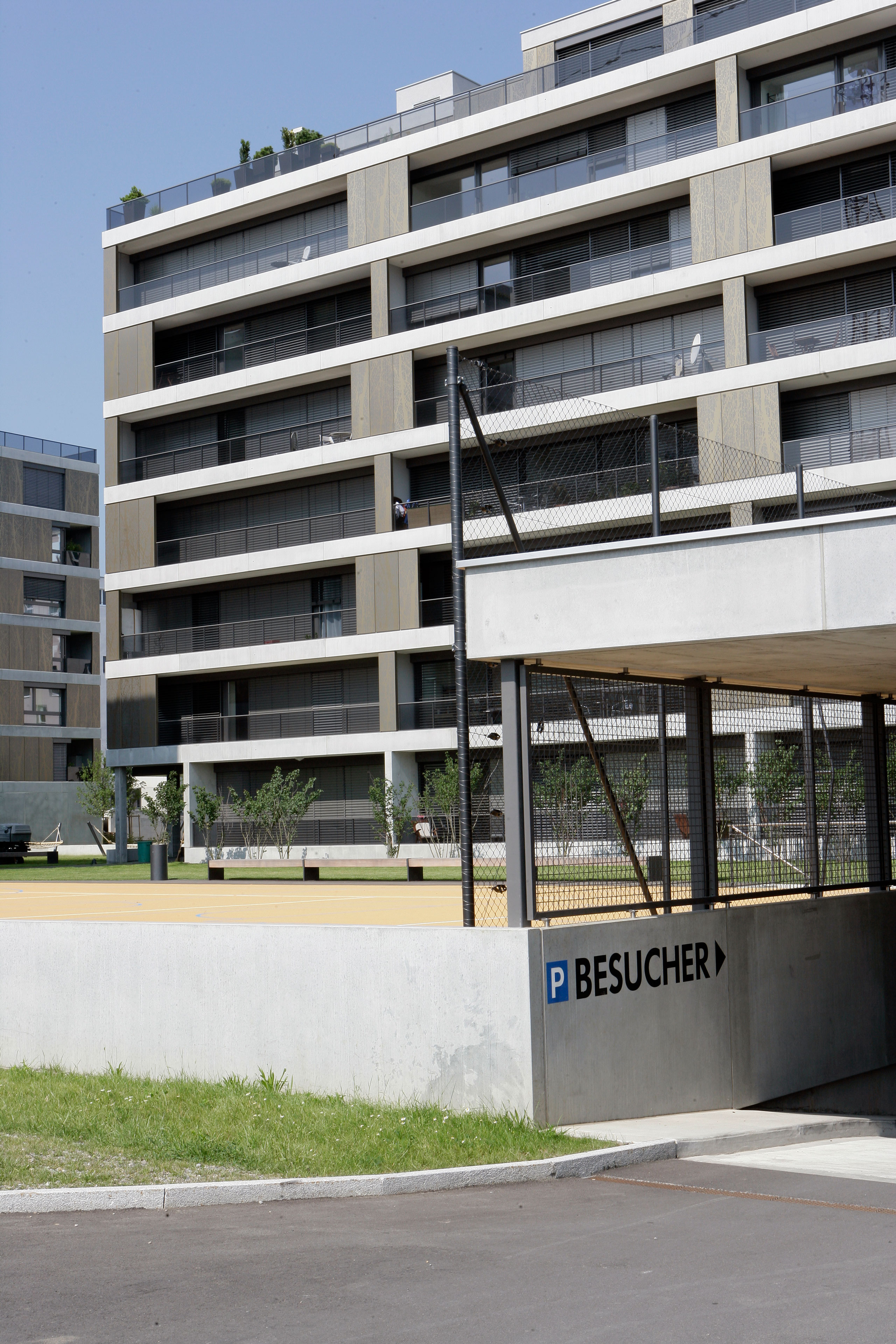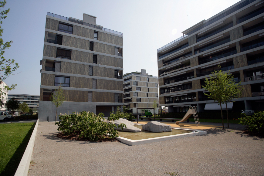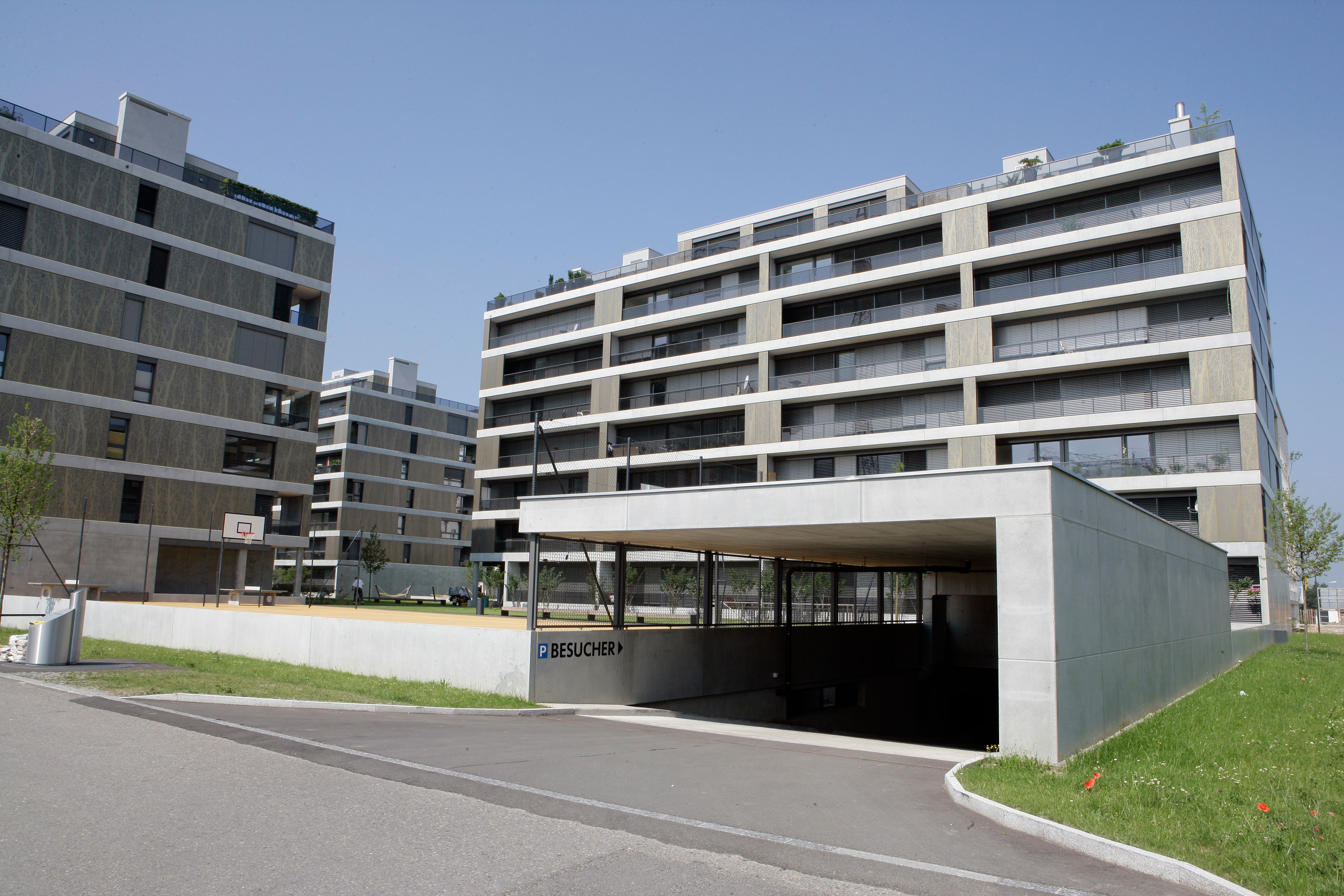Projekt: Neubau von 4 Mehrfamilienhäuser mit total 104 Eigentumswohnungen, zentrale Unterniveaugarage mit 173 Auto- und 9 Besucherparkplätzen, Fassade mit hinterlüfteten Metall-Paneelen und organischem Aufdruck, Minergie zertifiziert