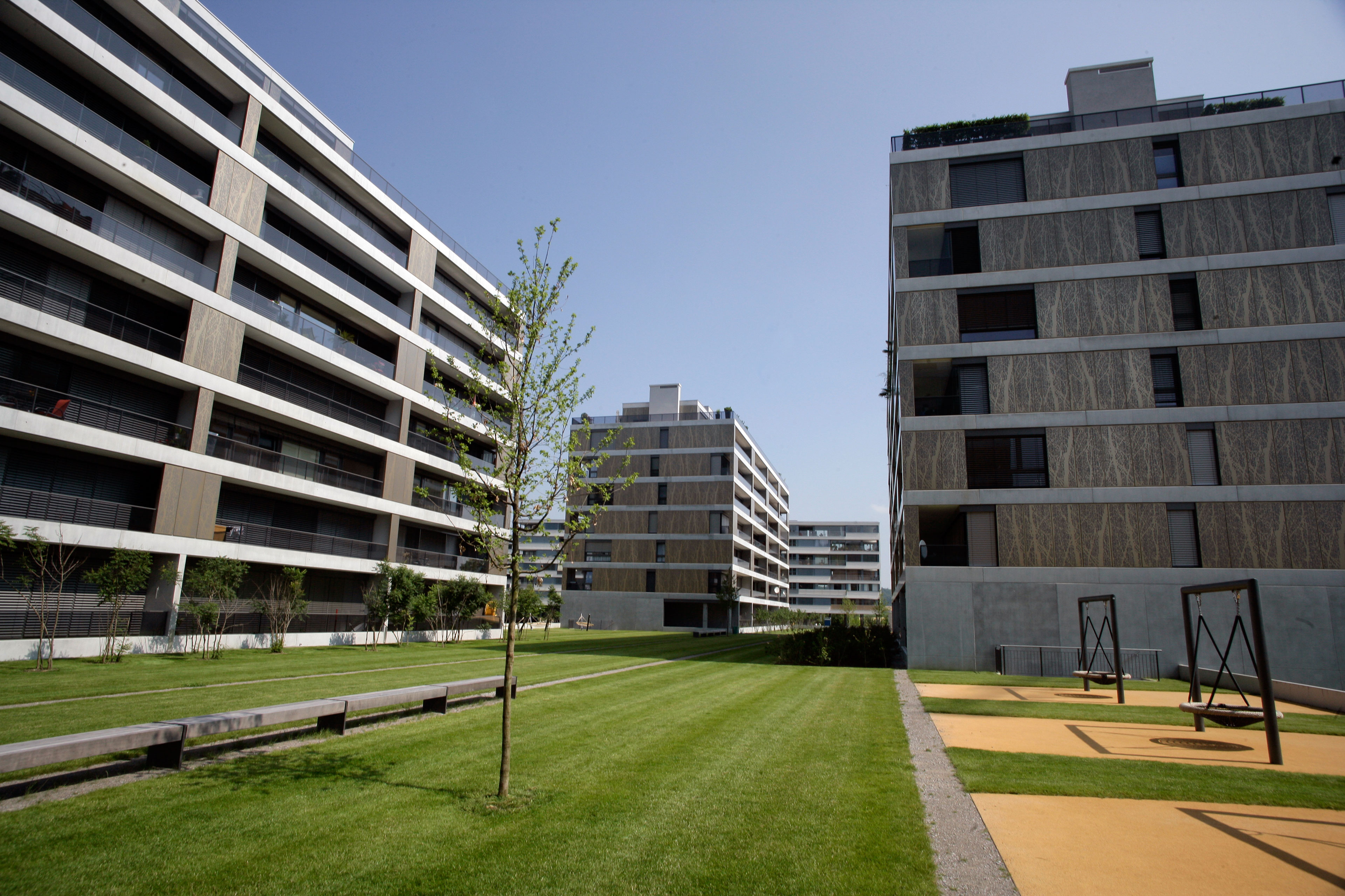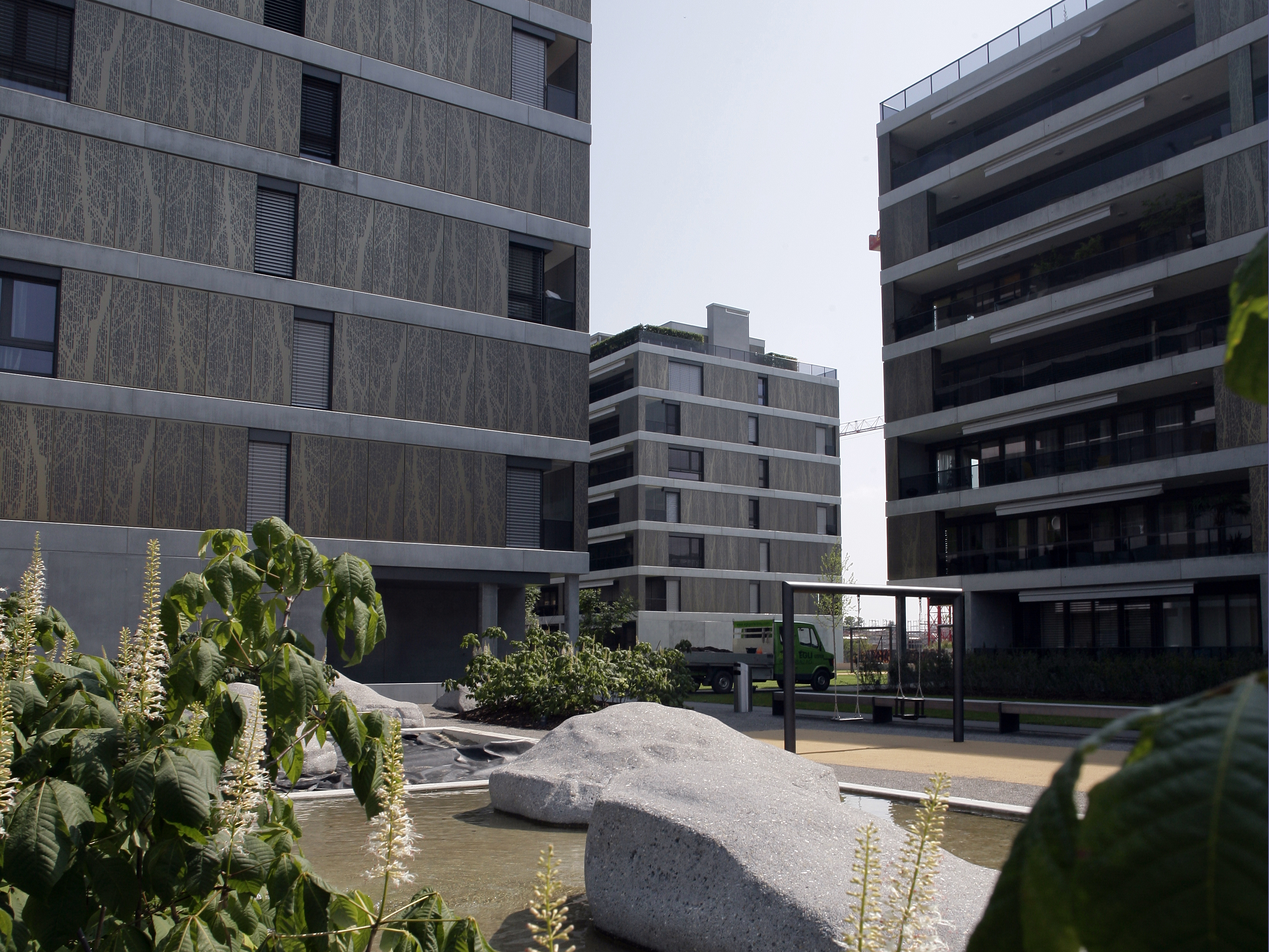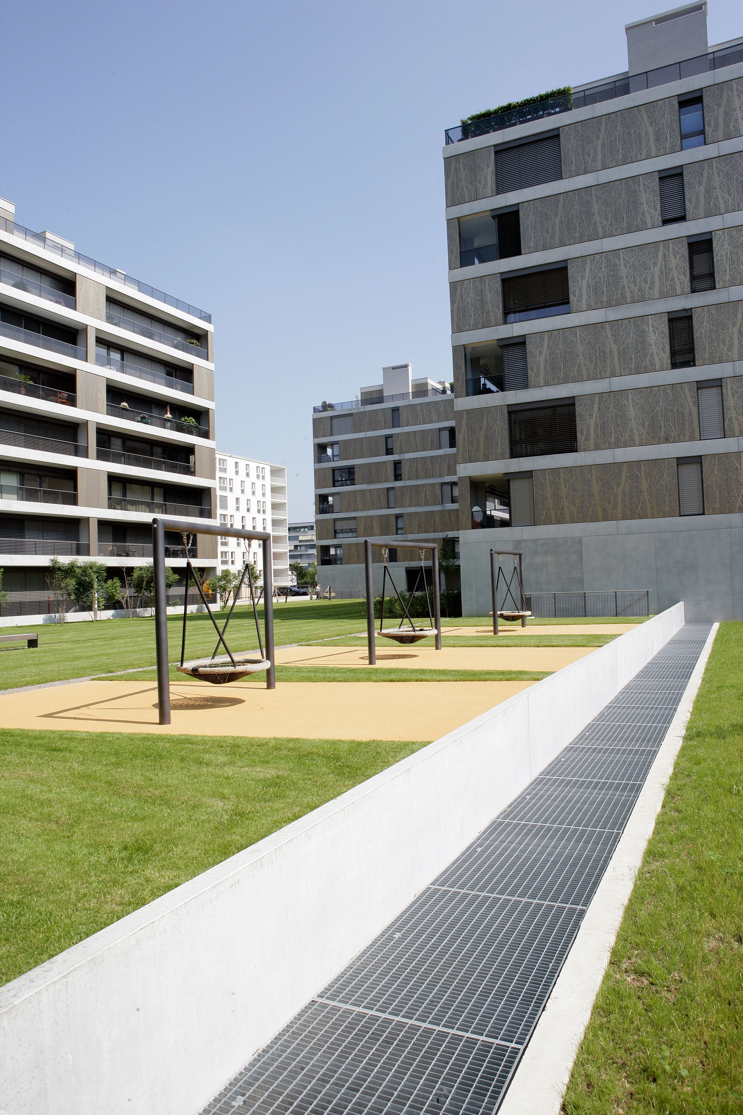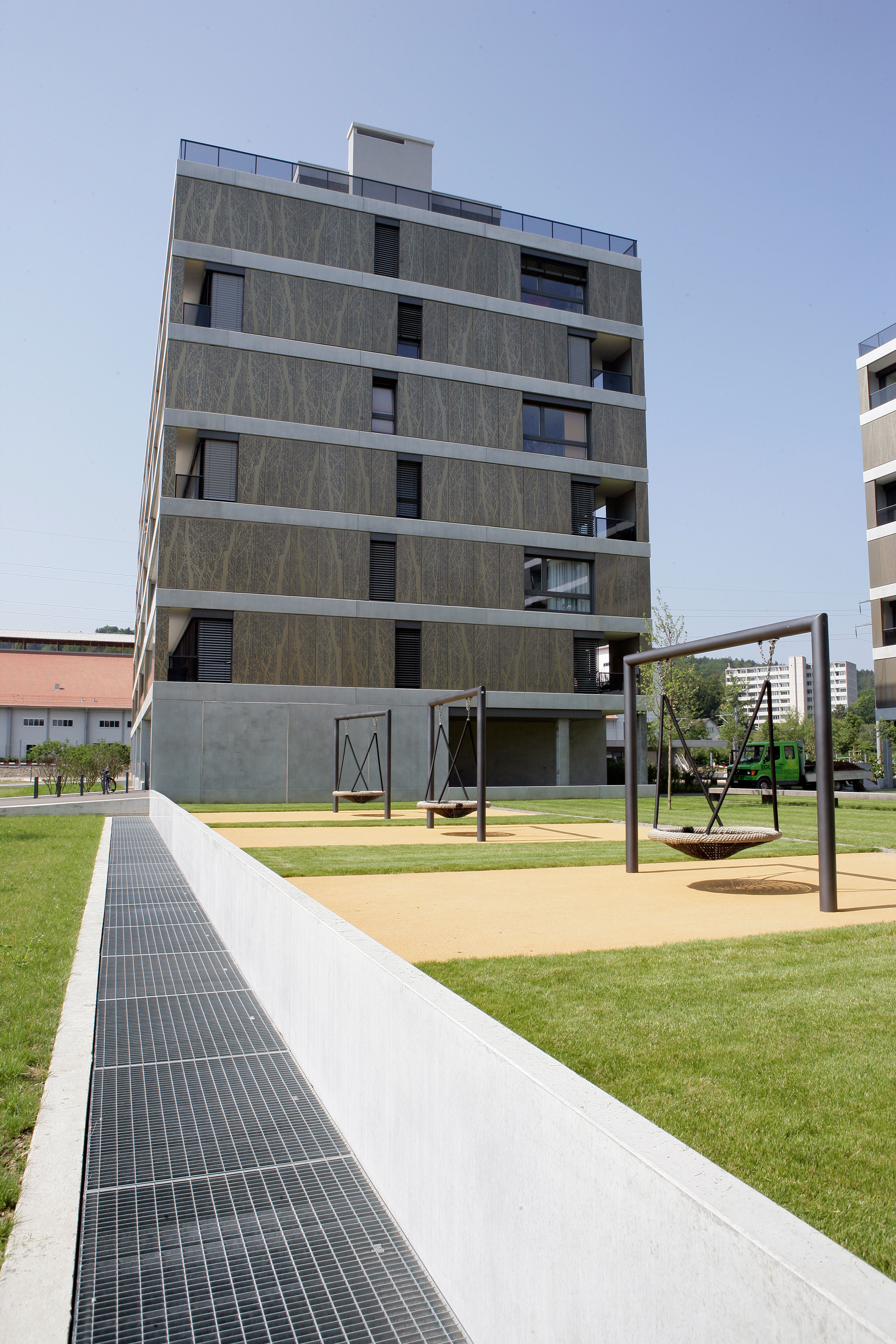 Projekt: Neubau von 4 Mehrfamilienhäuser mit total 104 Eigentumswohnungen, zentrale Unterniveaugarage mit 173 Auto- und 9 Besucherparkplätzen, Fassade mit hinterlüfteten Metall-Paneelen und organischem Aufdruck, Minergie zertifiziert