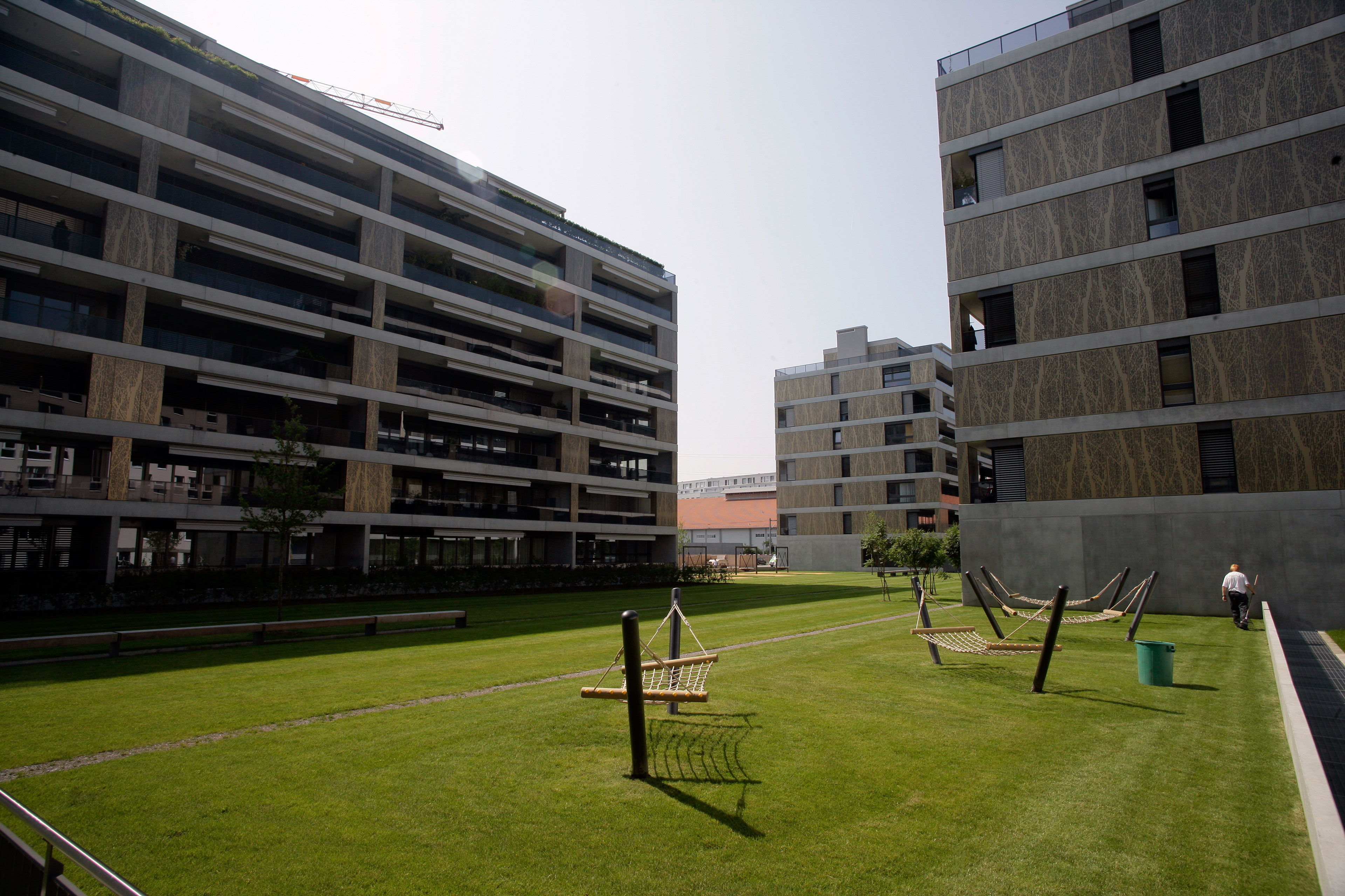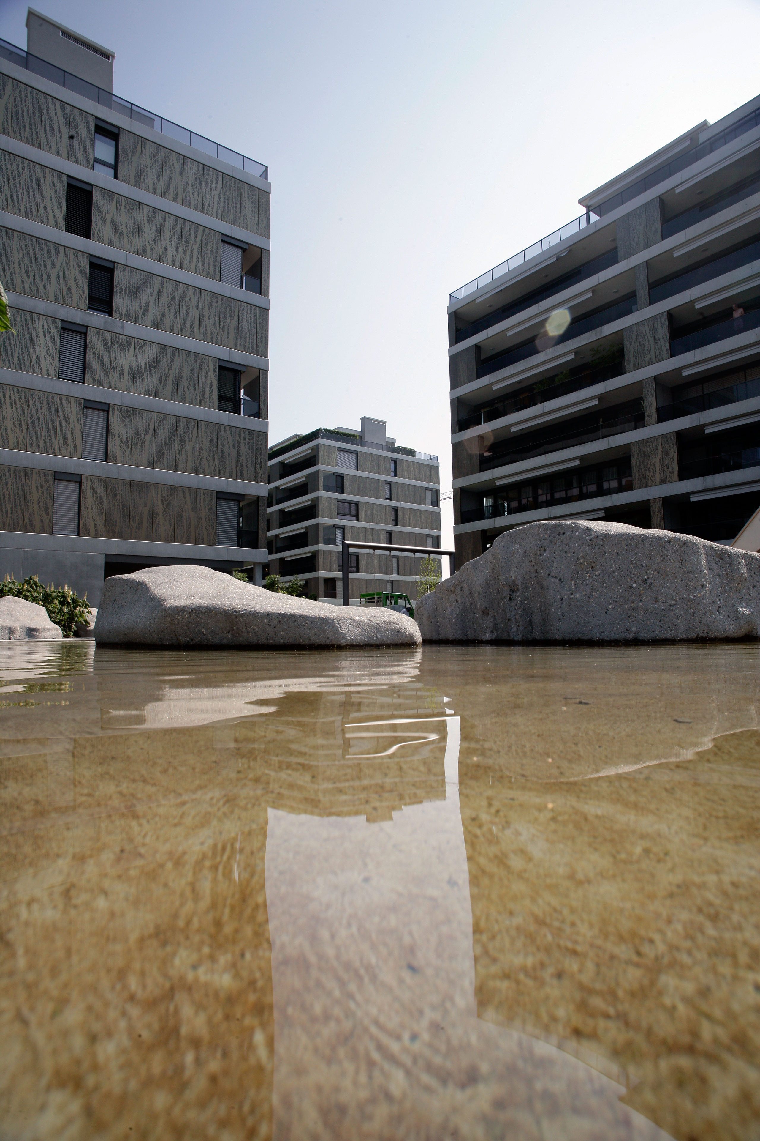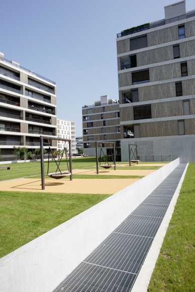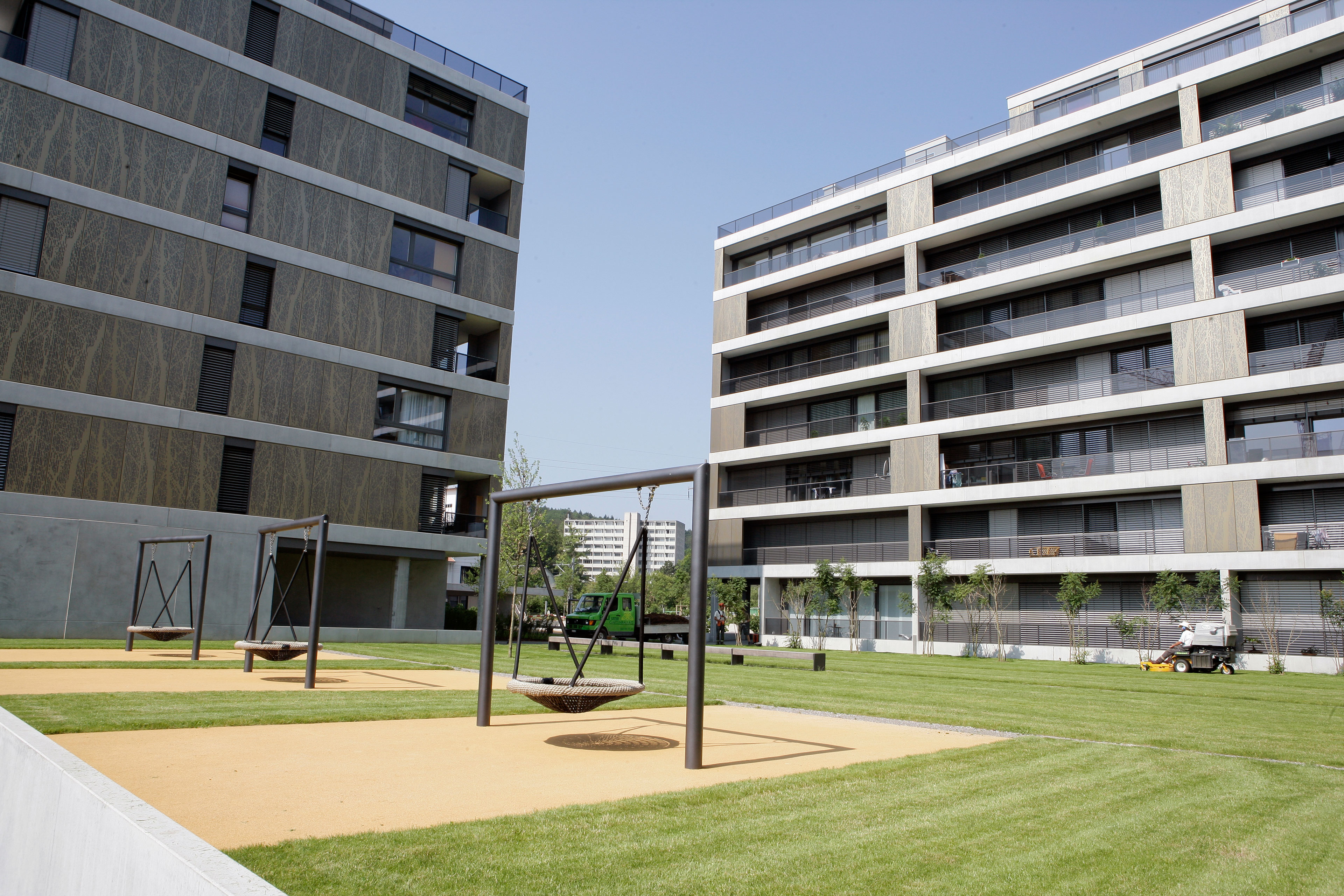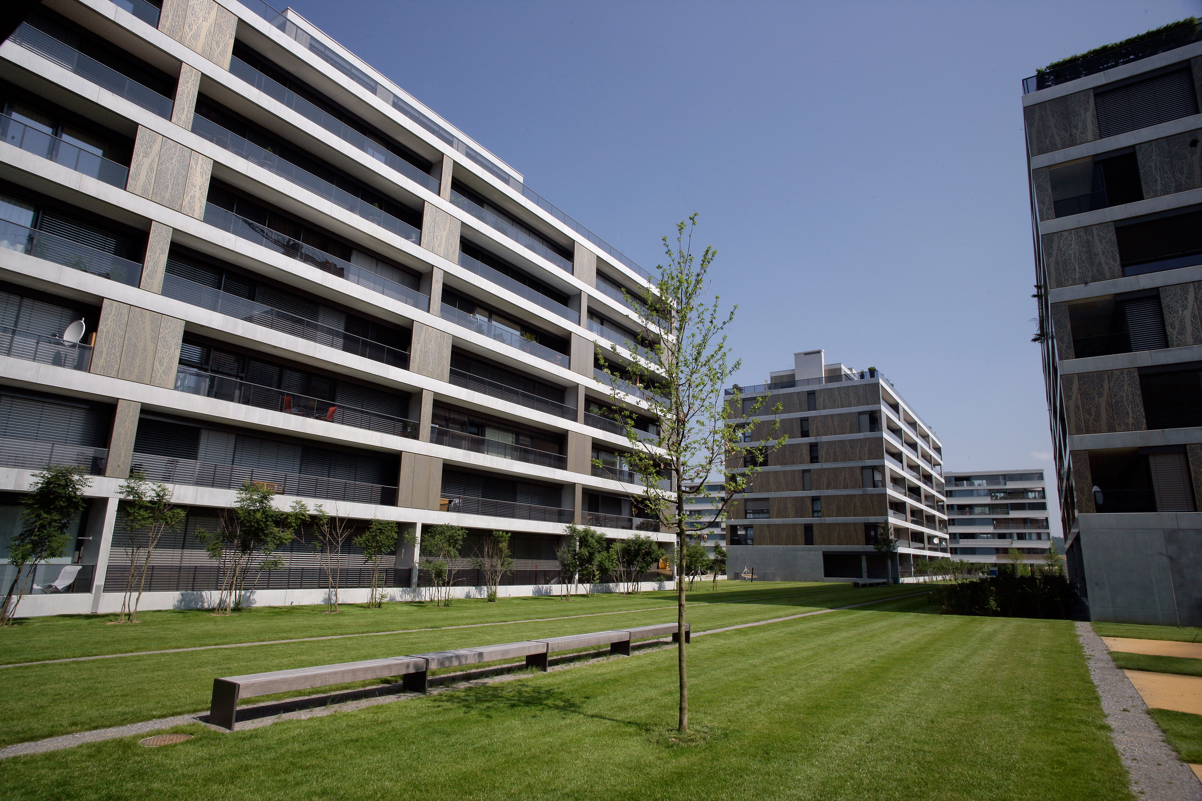 Projekt: Neubau von 4 Mehrfamilienhäuser mit total 104 Eigentumswohnungen, zentrale Unterniveaugarage mit 173 Auto- und 9 Besucherparkplätzen, Fassade mit hinterlüfteten Metall-Paneelen und organischem Aufdruck, Minergie zertifiziert